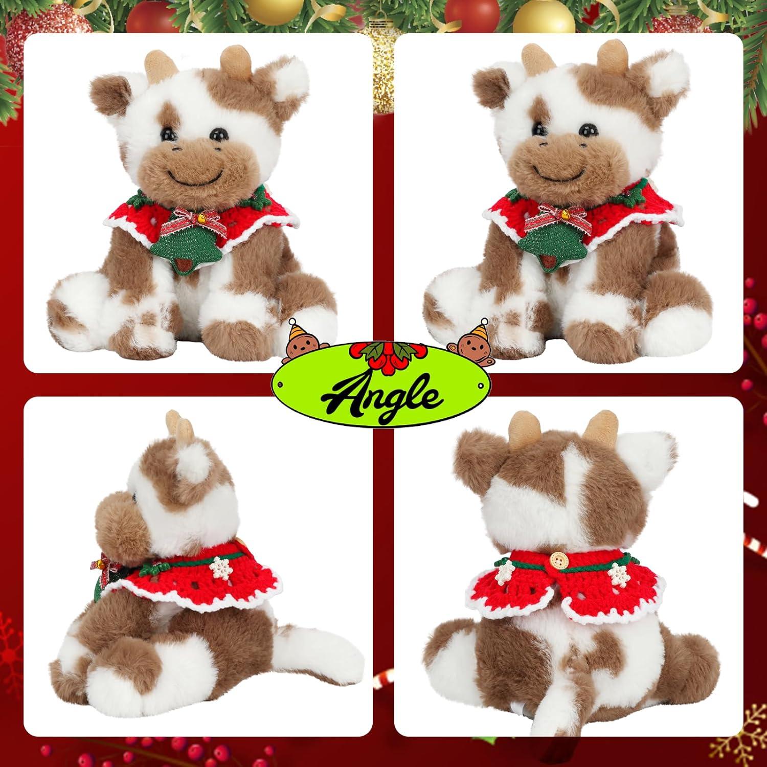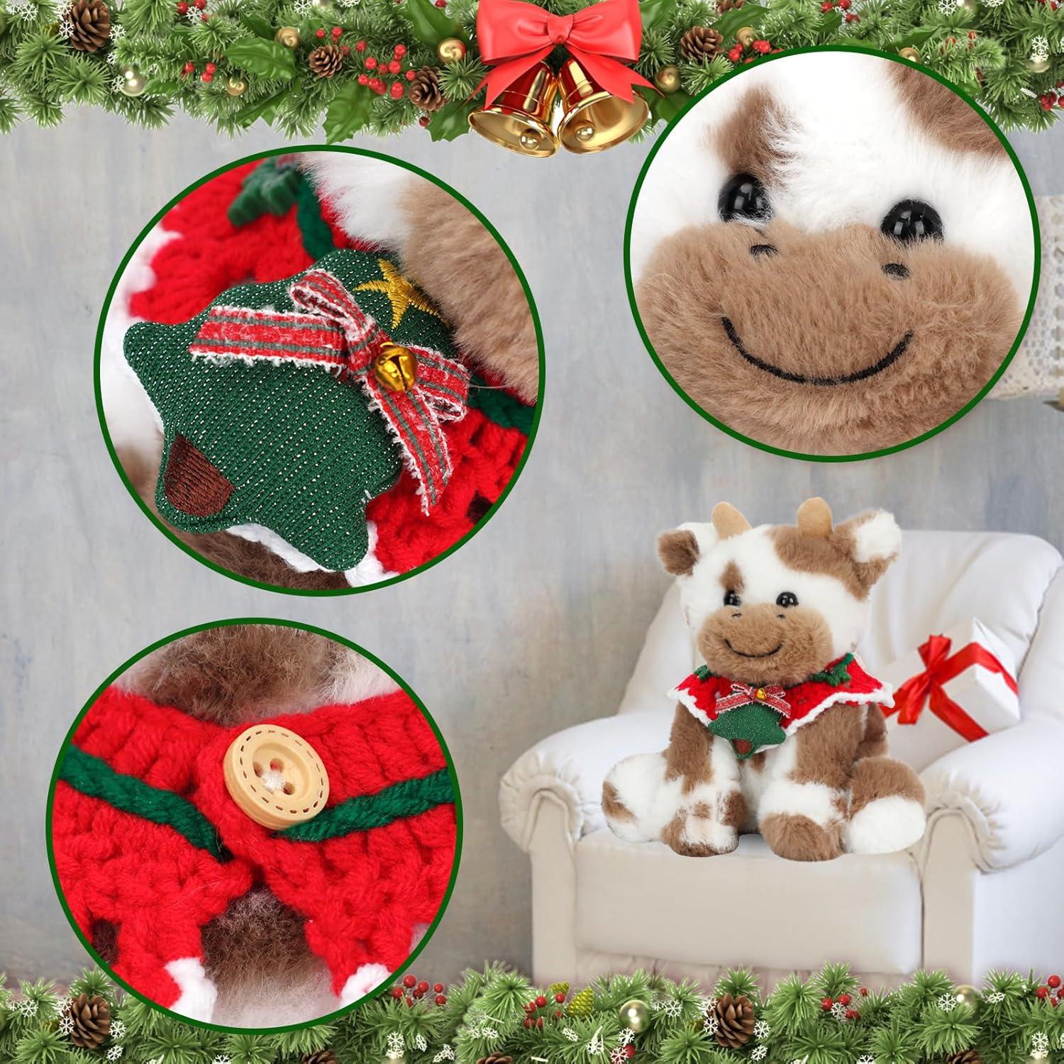 Hopearl Adorable Christmas Plush Cow Toy Floppy Dairy Cattle Soft Stuffed Animal Cute Xmas Gifts for Boys Girls Kids Toddlers, Light Brown, 9”(Xmas Black and White)