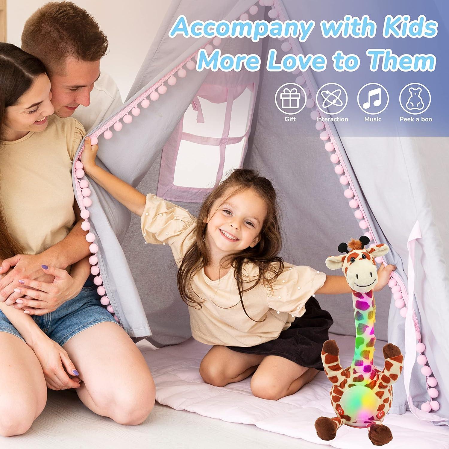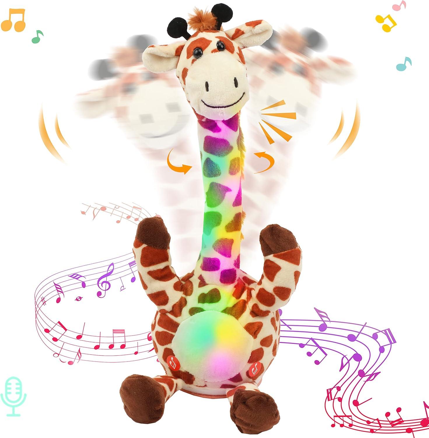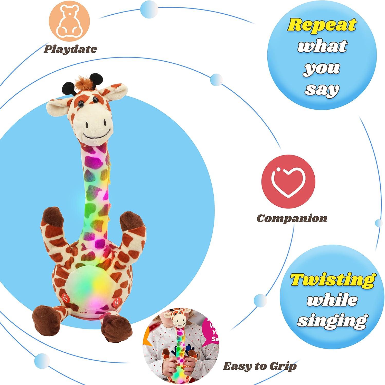 REPEAT WHAT YOU SAY: This magical giraffe toy looks like a living pet. Children can interact with it and learn a lot, it is very helpful for language training and can be used as a good preschool toy. It repeats everything you say no matter you laugh, sing or speak English or any other languages, it can record sound around it. This toy can change the original timbre of sound to make it in its funny, high pitched and cute voice. When it is still, it's an elegant giraffe.
