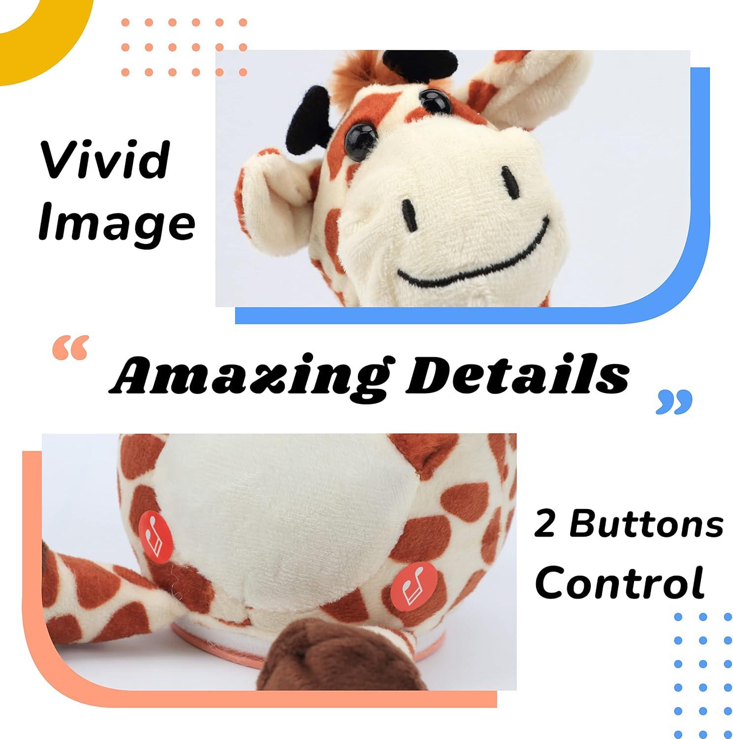 A INTERESTING TOY FOR KIDS: When you speak to this giraffe, you will get a response, not just recording and replaying, but a specially processed tone, just like a parrot. Meanwhile, our toy has the another function, it can play songs and keep dancing while the other button is pressed. Press one button, it will repeat. Press another button, it will sing.