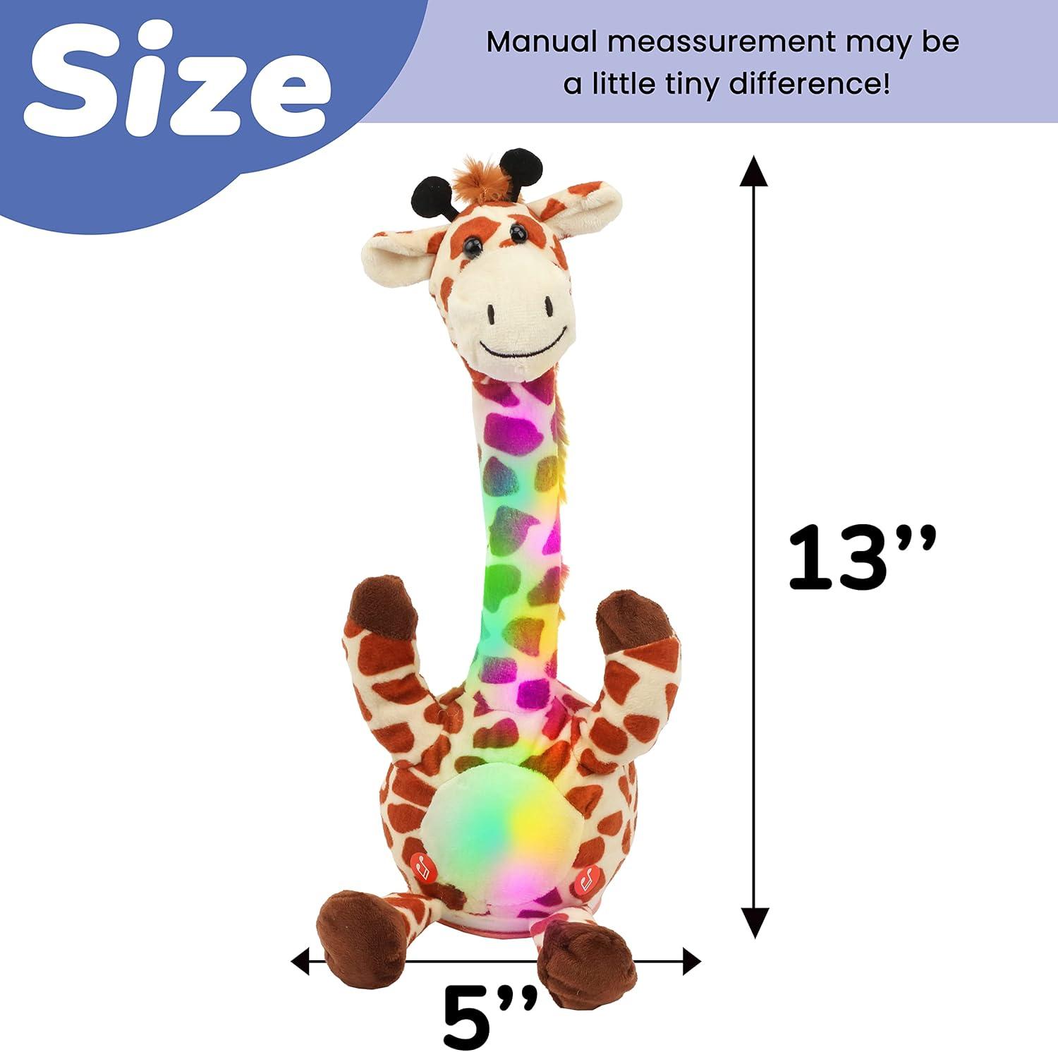 ABOUT TALKING GIRAFFE: This adorable giraffe measures about 13 inches tall, which is a suitable size for kids to carry with. And the portable light weight can let kids take it everywhere and play with. Interactive giraffe could attract children's attention easily, it gives you more space and time to do your own thing. So it will be a perfect gift for your kids.