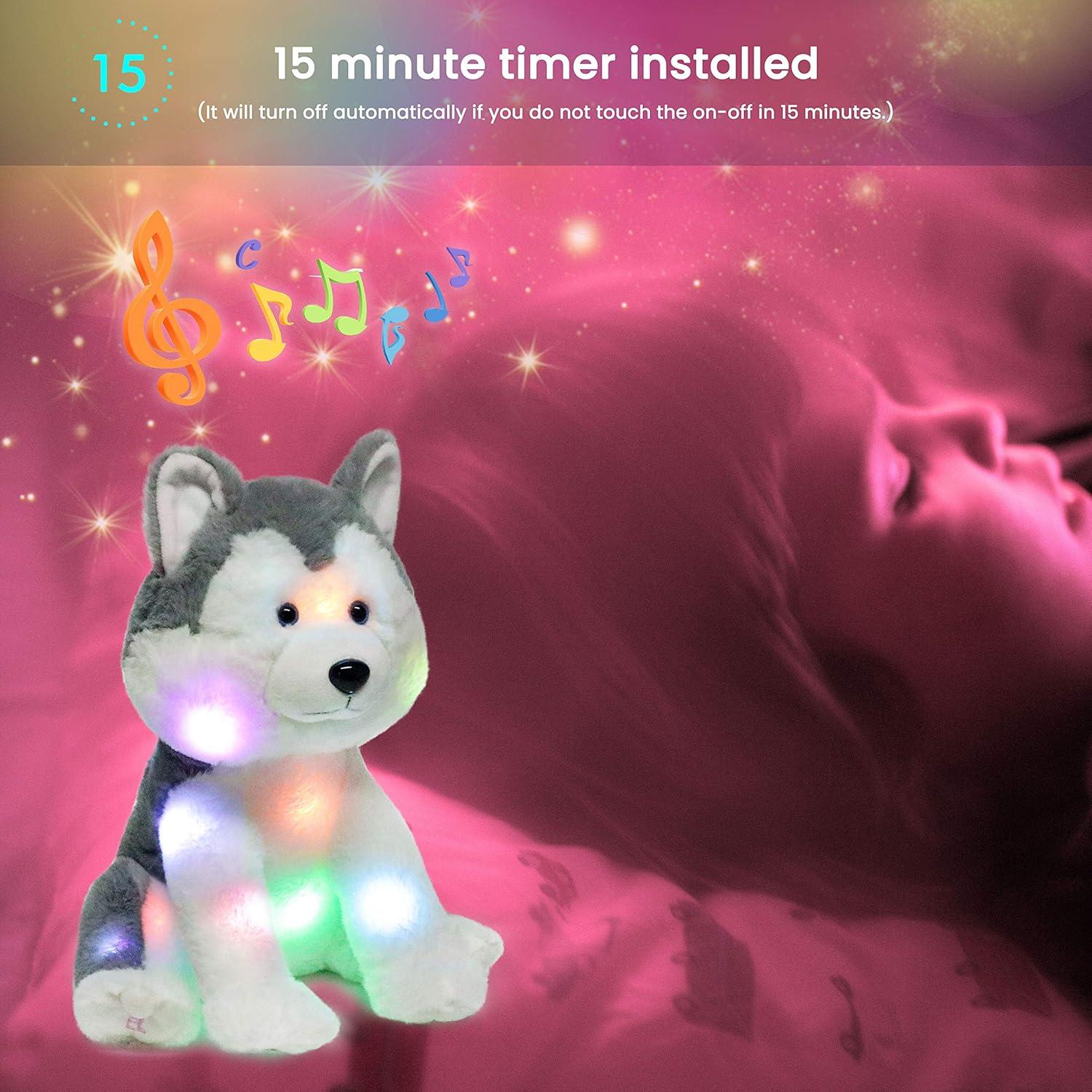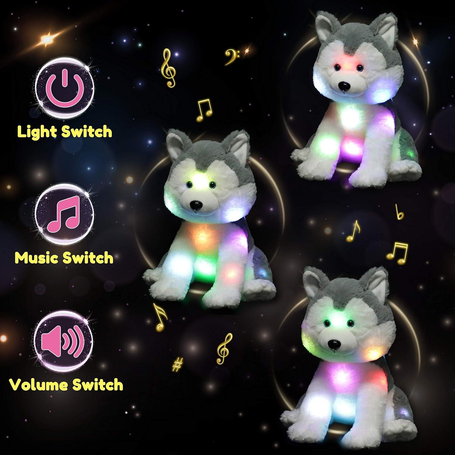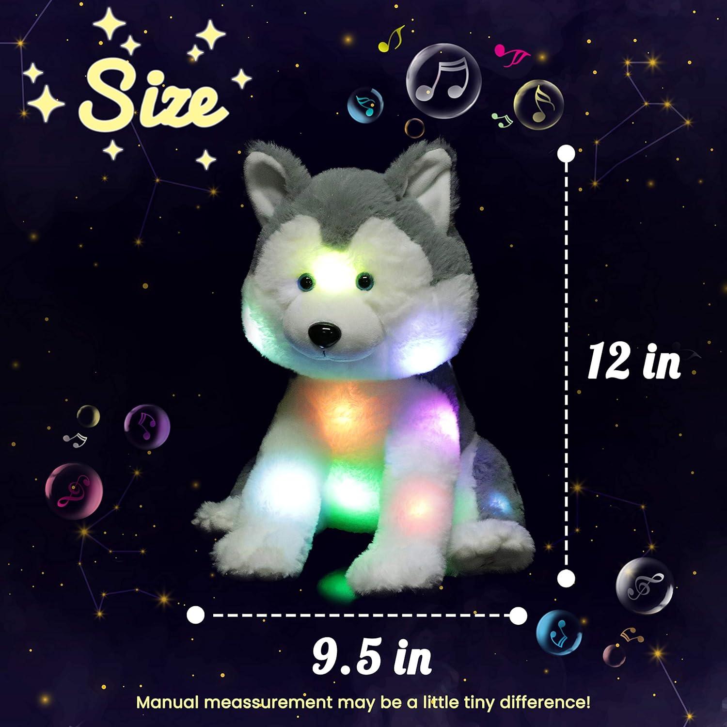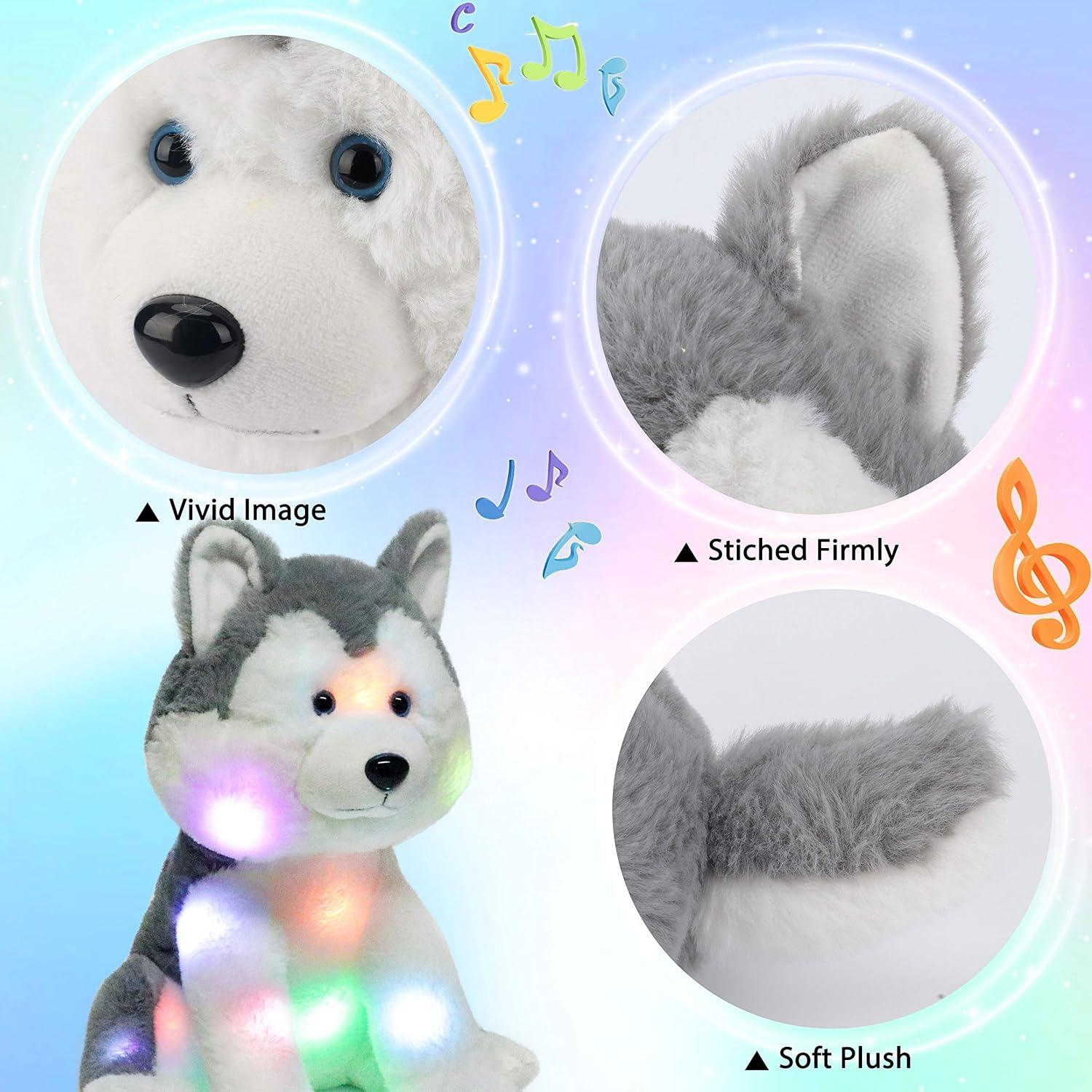 MUSICAL LIGHT UP PLUSH: This stuffed animal glows in the dark. The magical husky features a soothing lullaby sound and a color-changing glowing effect. Light up your kid's dormitory and help reduce the anxiety caused by the dark in your little ones. There are 10 songs are contained. Your kids can learn to sing with it and will get much fun.